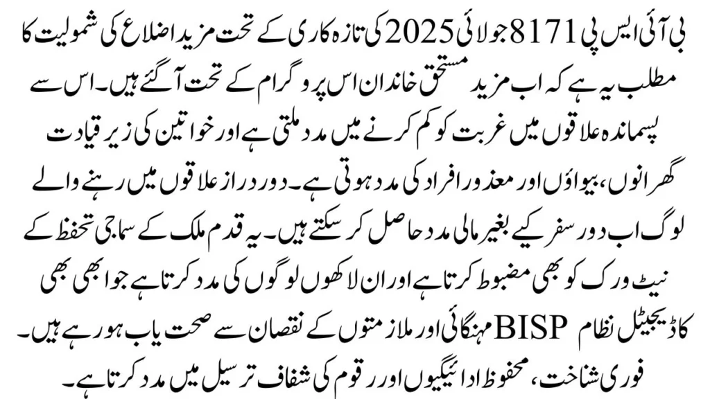 The inclusion of more districts under the BISP 8171 July 2025 update means that more deserving families are now covered under the program. This helps reduce poverty in backward areas and supports women-led households, widows, and disabled individuals. People living in remote regions can now access financial help without traveling far. The step also strengthens the country’s social safety net and supports millions who are still recovering from inflation and job losses. BISP’s digital system helps in quick identification, safe payments, and transparent delivery of funds.
