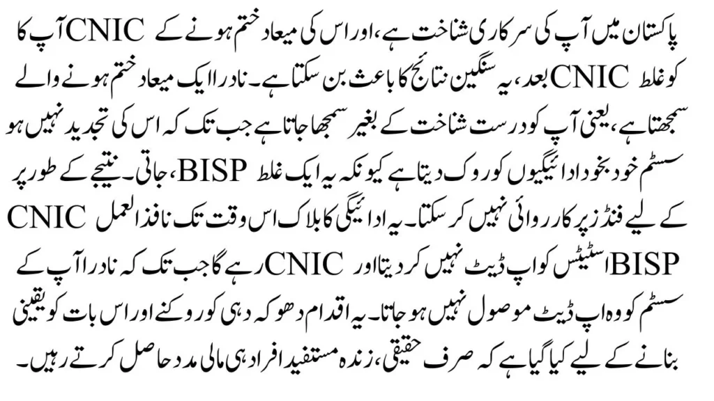 Dear sisters and brothers, always remember that your CNIC is not just a card – it is your identity for BISP, Ehsaas Kafalat, Benazir Taleemi Wazaif, and all government support schemes. If your CNIC is expired, renew it as a priority to avoid payment blockage.