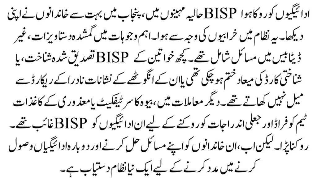 In recent months, many families in Punjab saw their BISP payments blocked. This happened because of problems in the system. The main reasons included missing documents, unverified identity, or issues in the BISP database. Some women had expired CNICs or their thumbprints did not match with NADRA records. In other cases, the widow certificate or disability documents were missing. The BISP team had to block these payments to stop fraud and fake entries. But now, a new system is available to help these families fix their issues and receive payments again.