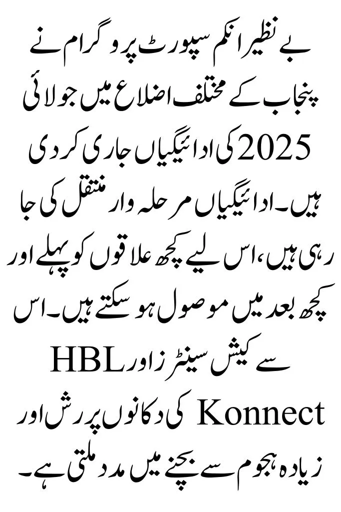 The Benazir Income Support Programme has released payments for July 2025 in different districts of Punjab. Payments are being transferred in phases, so some areas may receive earlier while others slightly later. This helps avoid rush and overcrowding at cash centres and HBL Konnect shops.
